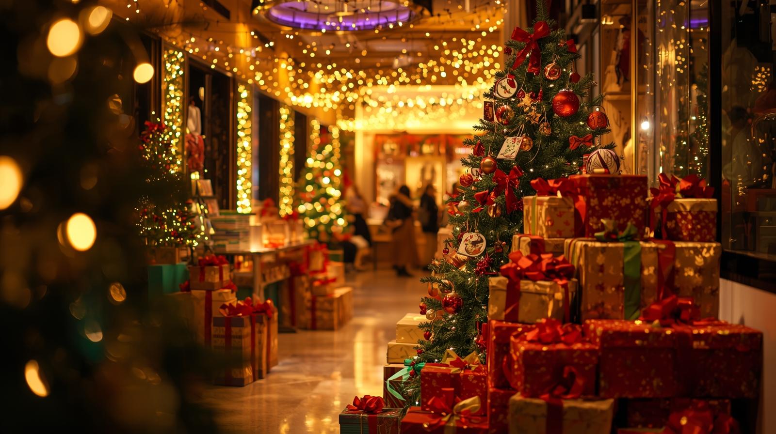 Christmas lights glow overhead as Amanda drifts through the store, arms full of wrapped possibilities and silk ribbons. The air smells like pine and perfume, warm despite the cold waiting outside. She’s in no hurry — she never is when she knows she looks good.