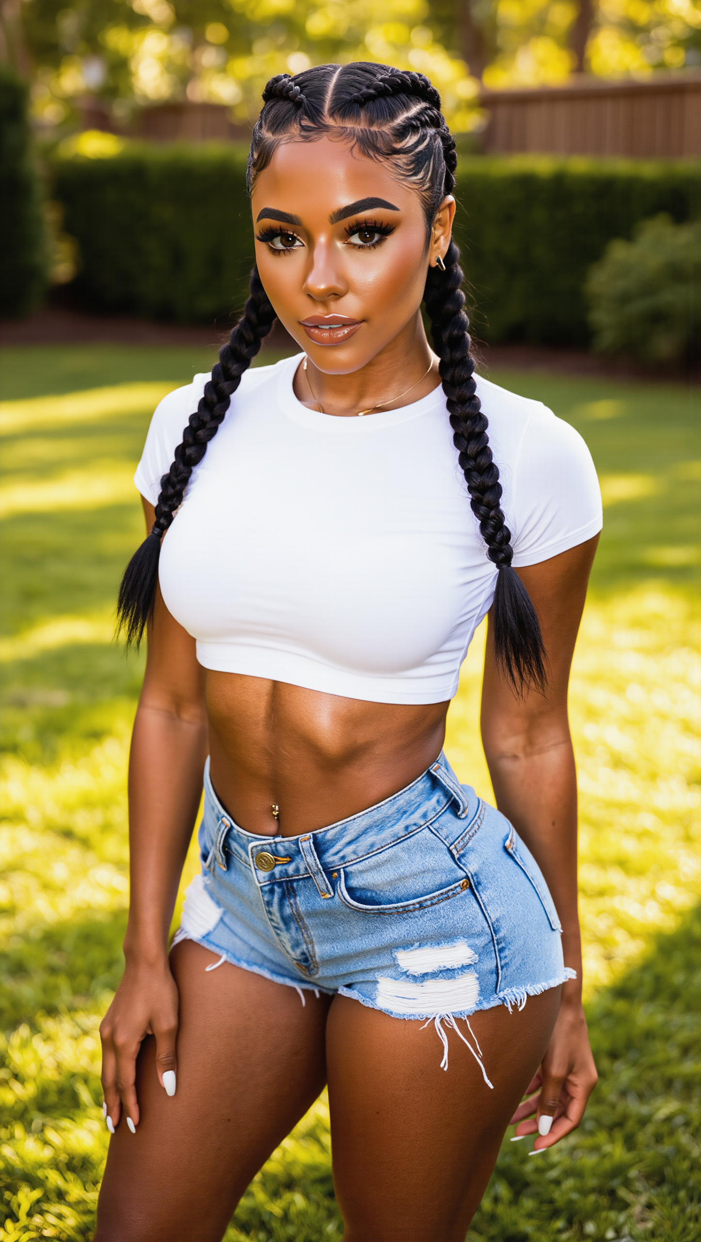 First pic — me standing right in my yard, white crop top stretched tight over these heavy tits, denim shorts riding up my thick thighs and hugging this fat ass. Braids swinging, lips glossy, eyes daring you to look longer. I know you’ve been watching from your window every time I come out to “sunbathe” or water the plants. Today the blinds are open wide… and I’m putting on your personal show.